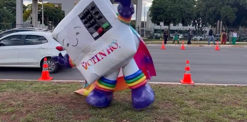 Um grupo LGBTQIA+ realizou um ato em frente à Superintendência da Polícia Federal nesta segunda-feira (24), em Brasília, para comemorar a prisão preventiva do ex-presidente Jair Bolsonaro. A mobilização contou com uma urna eletrônica inflável e com a presença do personagem “Votinho”, criado pela organização VoteLGBT.